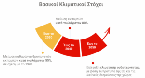 Σε συνέχεια αυτής της ευρωπαϊκής δέσμευσης, η Ελλάδα υιοθέτησε τον Εθνικό Κλιματικό Νόμο (Ν. 4936/2022), θεσπίζοντας ένα οριζόντιο ρυθμιστικό πλαίσιο για τη μετάβαση στην κλιματική ουδετερότητα. Ο νόμος συνδέεται άμεσα με το Εθνικό Σχέδιο για την Ενέργεια και το Κλίμα (ΕΣΕΚ) και καθορίζει νομικά δεσμευτικούς ενδιάμεσους στόχους, καθώς και υποχρεώσεις για επιχειρήσεις, δήμους και φορείς που δραστηριοποιούνται στην ελληνική επικράτεια.